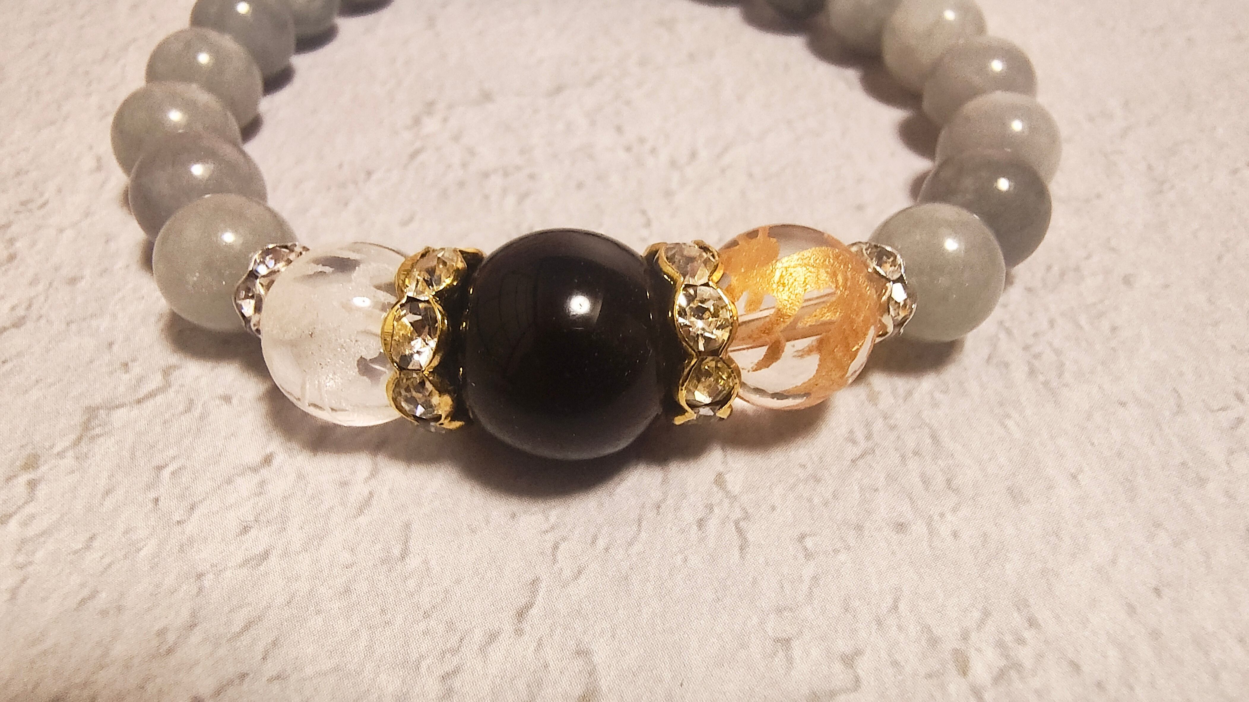 強力な厄払いの石として知られるモリオン(黒水晶)を中心に据え、その左右には「金」と「銀」、二体の昇り龍が刻印された水晶を配置。
