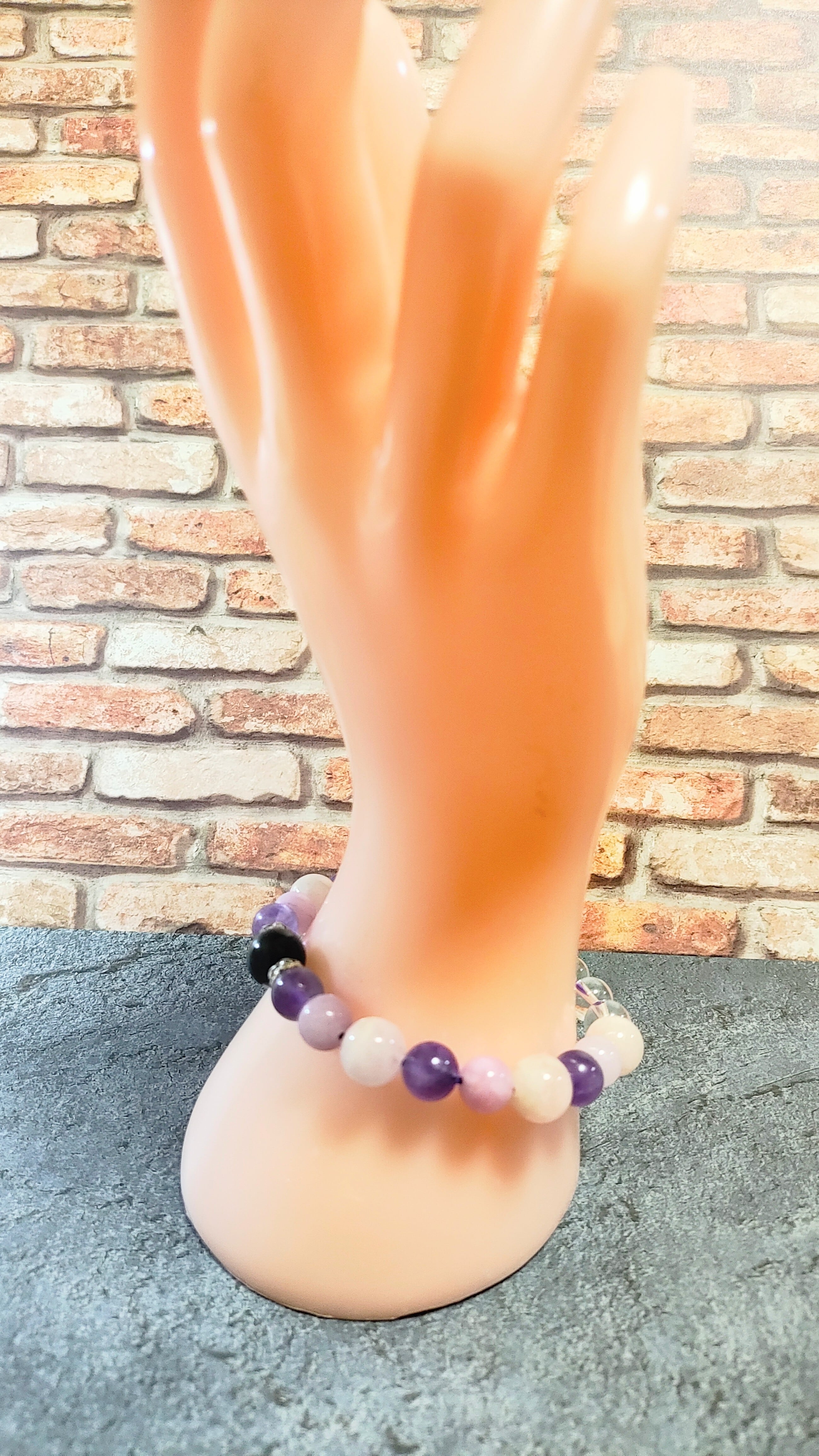 「凛 〜慈愛の守護〜」は、深い静寂のような漆黒の守護石(レインボーオブシディアン)を中心に、春の夜明けを思わせる柔らかな彩りの、モルガナイト、クンツァイト、アメジスト、水晶を添えたブレスレットです。